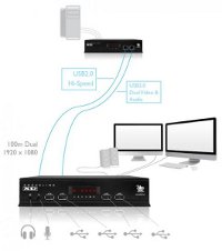 Er überträgt entweder zwei Videosignale mit einer Auflösung von 1920x1200 oder ein Signal bis zu einer Auflösung von 2560x1600 (WQXGA) sowie digitales Audio (S/PDIF), analoges Audio, Hi-Speed USB 2.0 und USB 2.0 (full and low speed) über CATx Kabel.